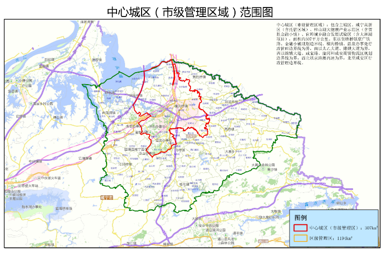 本實施細則所稱中心城區(qū),是指市級管理區(qū)域,包含主城區(qū)、咸寧高新區(qū)(含托管區(qū)域)、梓山湖大健康產業(yè)示范區(qū)(含賀勝金融小鎮(zhèn))、官埠城鄉(xiāng)融合發(fā)展試驗區(qū)(含大洲湖項目),面積約307平方公里。東以賀勝橋鎮(zhèn)京廣鐵路、金融小鎮(zhèn)規(guī)劃邊界線、橫溝橋鎮(zhèn)和溫泉街道辦事處行政管理邊界線為界;南以太乙大道、嫦娥大道為界;西以嫦娥大道、咸寶路、淦河和咸安商貿物流區(qū)規(guī)劃邊界線為界;西北以京港澳高速為界,北至咸安區(qū)行政管理邊界線。(具體范圍見附件)